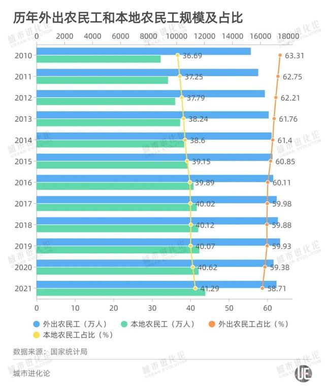 2021年,留在自己鄉(xiāng)鎮(zhèn)的農(nóng)民工又增加了,達到1.21億人,占四成有余;外出農(nóng)民工雖然是主流,為1.72億人,不過占比一直在下降,從2010年的63.31%下滑至2021年的58.71%。