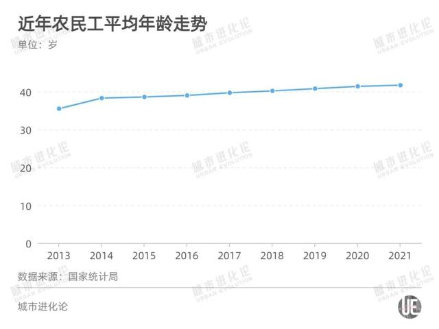 整體來看,全國農(nóng)民工的平均年齡逐年提高。2013年農(nóng)民工平均年齡35.5歲,2021年已經(jīng)達到41.7歲。