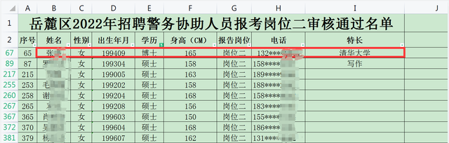 據(jù)長沙市岳麓區(qū)于5月21日中午12點公布的《岳麓區(qū)2022年招聘警務(wù)協(xié)助人員報考審核通過名單公告》顯示,在通過“警務(wù)協(xié)助人員崗位二”審核的人員表格中,出現(xiàn)了眾多本科碩士人員,其中最高學(xué)歷為一位1994年出生的張姓女博士(特長備注為“清華大學(xué)”),另有研究生10人,本科349人。公告顯示,名單中人員已完成警務(wù)協(xié)助人員報名和資格審查,將按照要求參加體能測試。不過,據(jù)@九派新聞報道,23日,岳麓區(qū)相關(guān)人員表示,該張姓博士系在校生,不符合招聘條件,因此遺憾未被錄取。