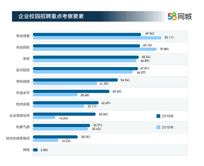 在企業(yè)校園招聘中,人才篩選要素中排名前四的依次是專業(yè)背景、畢業(yè)院校、學(xué)歷、實習(xí)經(jīng)歷。與去年相比,雇主對于專業(yè)背景、畢業(yè)院校的選擇比例有所下降,分別下降了13.15%和10.70%;而對學(xué)歷和實習(xí)經(jīng)歷的選擇比例有所提升,分別上升了1.35%和3.24%。隨著產(chǎn)業(yè)的跨界融合發(fā)展,新晉職場者常常要從事跨專業(yè)工作,企業(yè)對專業(yè)背景的關(guān)注度有所下降。