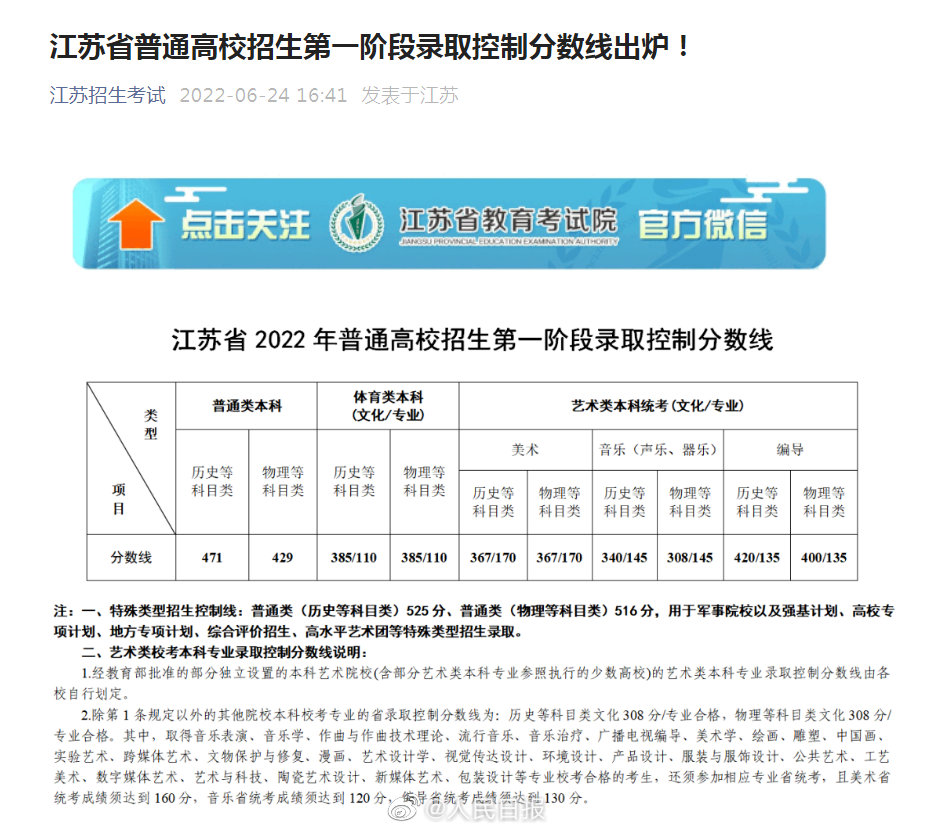 【#2022高考江蘇分?jǐn)?shù)線#】普通類(lèi)本科:歷史等科目類(lèi)471 分,物理等科目類(lèi)429分。 ???