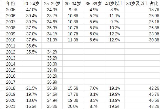 同時(shí),30-34歲人群占比達(dá)到了20%,比上一年提升了0.7個(gè)百分點(diǎn),連續(xù)兩年超過20-24歲人群成為占比第二高的年齡段,比2005年提升了10.1個(gè)百分點(diǎn);35-39歲人群占比達(dá)到了8.7%,比上一年提升了0.4個(gè)百分點(diǎn),比2005年提升了3.8個(gè)百分點(diǎn);40歲以上人群占比達(dá)到19.5%。
