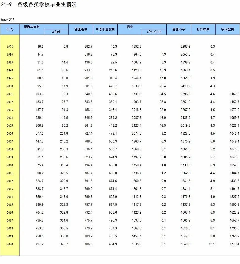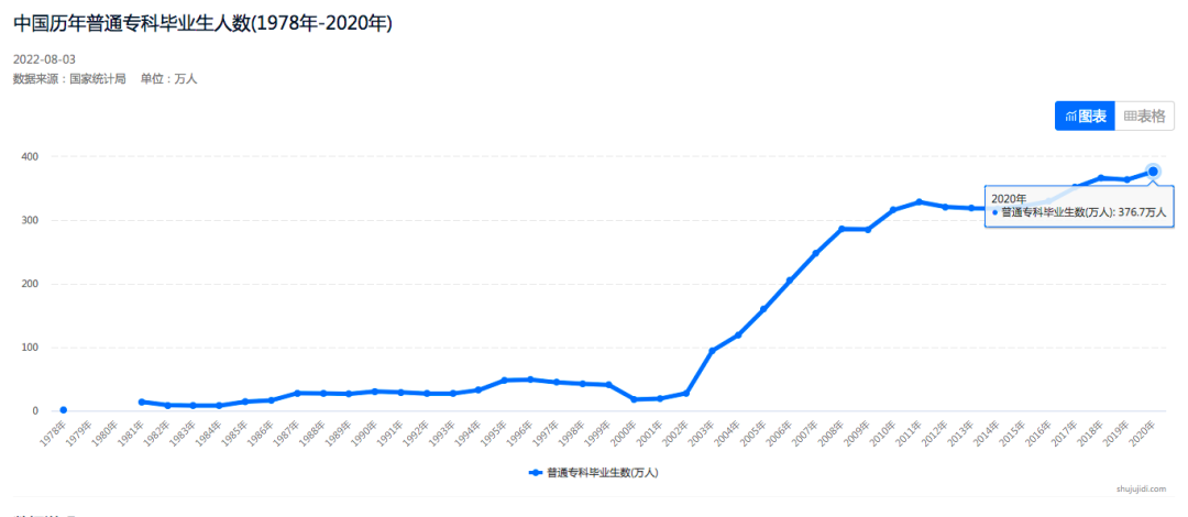 (中國歷年普通??飘厴I(yè)生人數(shù),截圖自數(shù)據基地)