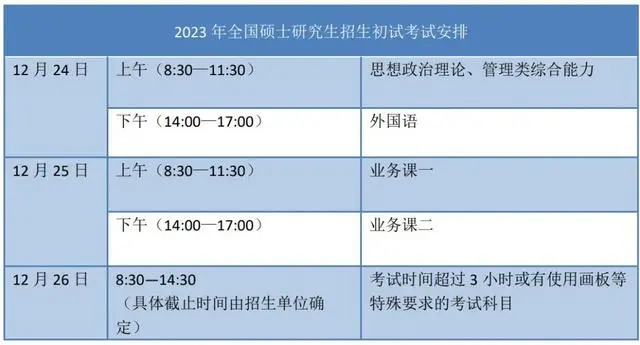 2023年全國碩士研究生招生考試初試時間為12月24日至25日(每天上午8:30—11:30,下午14:00—17:00)。超過3小時的考試科目在12月26日進行(起始時間8:30,截止時間由招生單位確定,不超過14:30)。