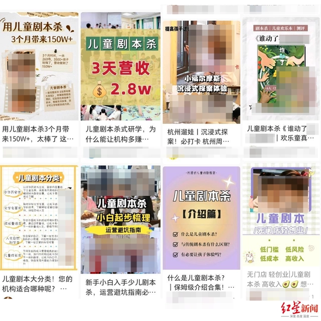 值得注意的是,大部分內(nèi)容都在強調(diào)兒童劇本殺輕資產(chǎn)、低門檻、收入高,不僅可以作為教培機構的消課方式,也可以作為線下兒童書店增強顧客體驗的手段。“目前是藍海市場,關于兒童劇本殺的市場競爭較緩……全新的兒童文化娛樂賽道將打開兒童教學娛樂的新局面。”某兒童劇本殺品牌在視頻中介紹。
