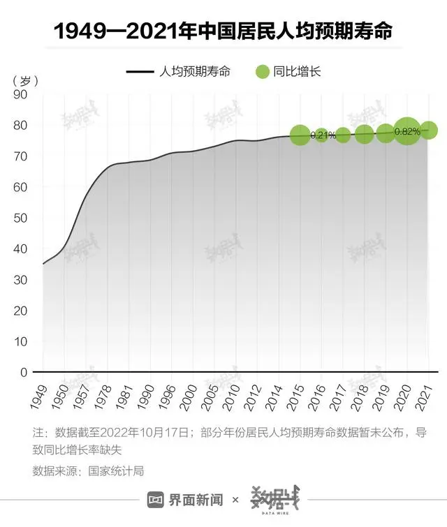 國家統(tǒng)計局?jǐn)?shù)據(jù)顯示,新中國成立初期我國人均預(yù)期壽命僅為35歲,而在2021年,我國人均預(yù)期壽命已上漲43.2歲至78.2歲,漲幅達(dá)123.43%。界面數(shù)據(jù)統(tǒng)計發(fā)現(xiàn),2015年-2021年,我國人均預(yù)期壽命逐年增長,但增幅較小且值呈波動趨勢,均在1%以下。