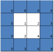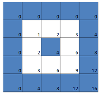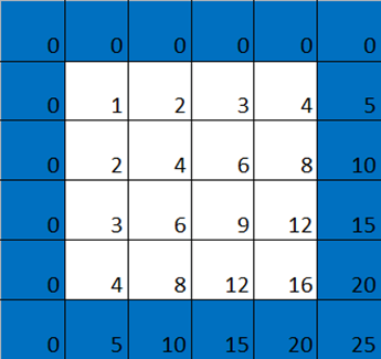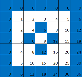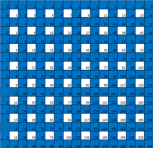 我們在表格的頂部和左側(cè)各添加一行 / 列 0,仍然是一個乘法表,只是便于我們看出下面的一些圖案。