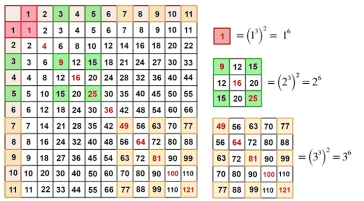 我們可以使用另一個有趣的結(jié)論,一個立方數(shù) (一個數(shù)的 3 次方) 可以寫成一個連續(xù)奇數(shù)的和。例如,13=1,23=8=3+5,和 33=27=7+9+11.因此,如果我們選擇的是這些連續(xù)的奇數(shù)行和奇數(shù)列的交點的方形格,這些方形格中數(shù)字的和將是一個立方數(shù)的平方,也就是一個數(shù)的 6 次方。下面的綠色方塊是第 3、5 行與第 3、5 列的交點,它們的和是 (3+5)2=(23)2=26. 黃色方塊是第 7、9、11 行與第 7、9、11 列的交點,它們的和是 (7+9+11)2=(33)2=36.
