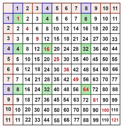 在整數(shù)的海洋中,乘法表主對角線(從西北角到東南角)上的紅色數(shù)字顯然是平方數(shù) —— 整數(shù)的 2 次方。