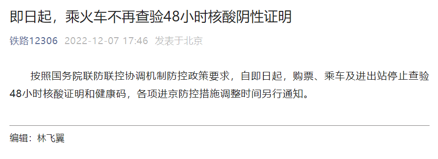 隨后,鐵路12306官方發(fā)布公告,按照國務(wù)院聯(lián)防聯(lián)控協(xié)調(diào)機制防控政策要求,自即日起,購票、乘車及進出站停止查驗48小時核酸證明和健康碼。
