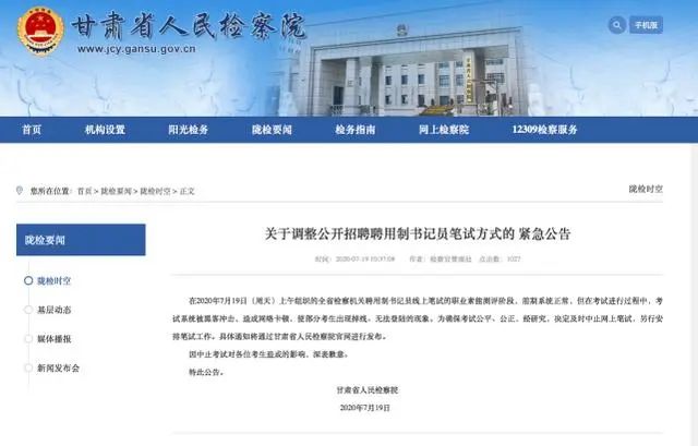 為確??荚嚬?、公正,經(jīng)研究,決定及時中止網(wǎng)上筆試,另行安排筆試工作。具體通知將通過甘肅省人民檢察院官網(wǎng)進行發(fā)布。因中止考試對各位考生造成的影響,深表歉意。