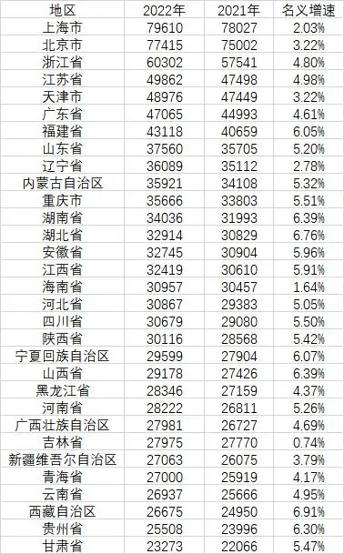 國(guó)家統(tǒng)計(jì)局公布:31省2022年人均收入