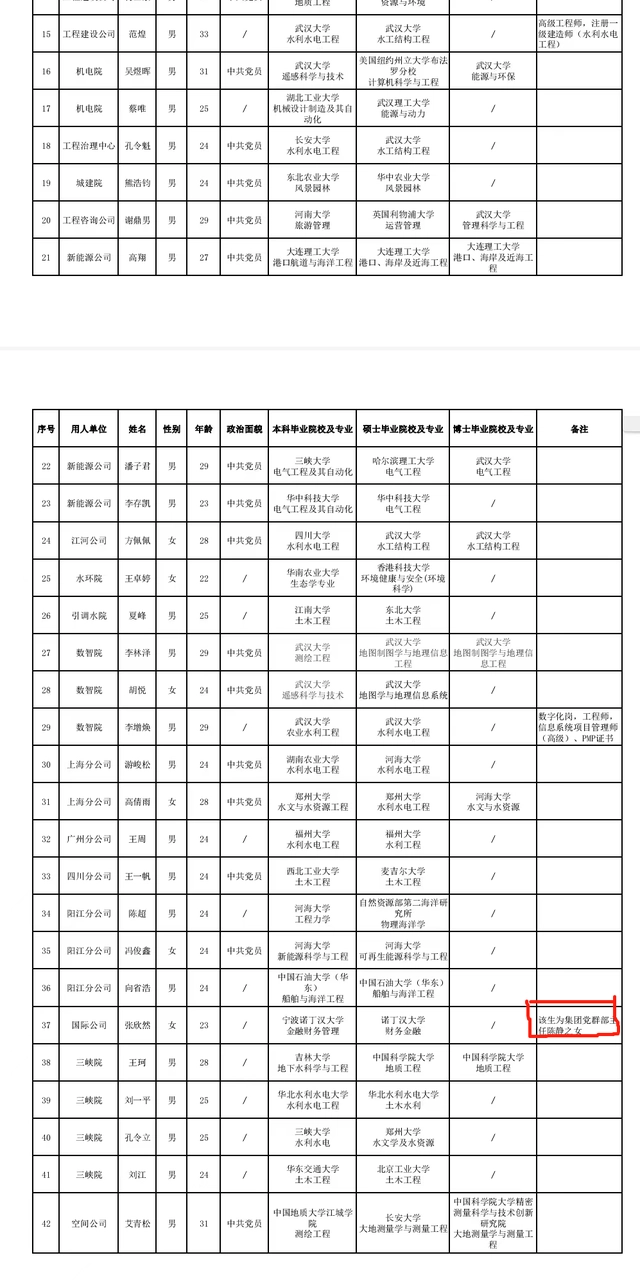 記者通過該集團去年10月12日發(fā)布的公開招聘發(fā)現(xiàn),長江設(shè)計集團擬招聘專業(yè)技術(shù)崗279人,市場經(jīng)營崗4人,職能管理崗15人,其中集團國際公司擬招聘5人,而張欣然正是被該集團國際公司所聘。而記者觀察其2日發(fā)布的擬聘人員公示名單備注信息一欄,多為擬聘人員所取得的相關(guān)專業(yè)資質(zhì),而張欣然的公示信息備注欄則為“該生為集團黨群部主任陳靜之女”。