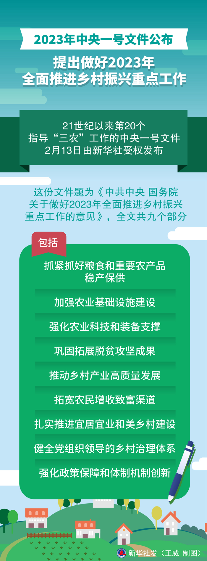 這份文件題為《中共中央 國務院關于做好2023年全面推進鄉(xiāng)村振興重點工作的意見》,全文共九個部分,包括:抓緊抓好糧食和重要農(nóng)產(chǎn)品穩(wěn)產(chǎn)保供、加強農(nóng)業(yè)基礎設施建設、強化農(nóng)業(yè)科技和裝備支撐、鞏固拓展脫貧攻堅成果、推動鄉(xiāng)村產(chǎn)業(yè)高質(zhì)量發(fā)展、拓寬農(nóng)民增收致富渠道、扎實推進宜居宜業(yè)和美鄉(xiāng)村建設、健全黨組織領導的鄉(xiāng)村治理體系、強化政策保障和體制機制創(chuàng)新。