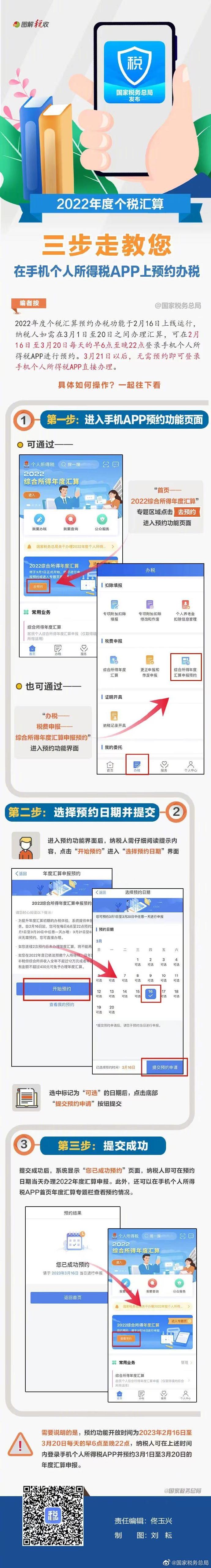 2022年度個稅匯算預約辦稅功能于2月16日上線運行,如需在3月1日至20日之間辦理匯算,可在2月16日至3月20日每天的早6點至晚22點登錄個稅APP進行預約。3月21日以后,無需預約即可登錄手機個人所得稅APP直接辦理。