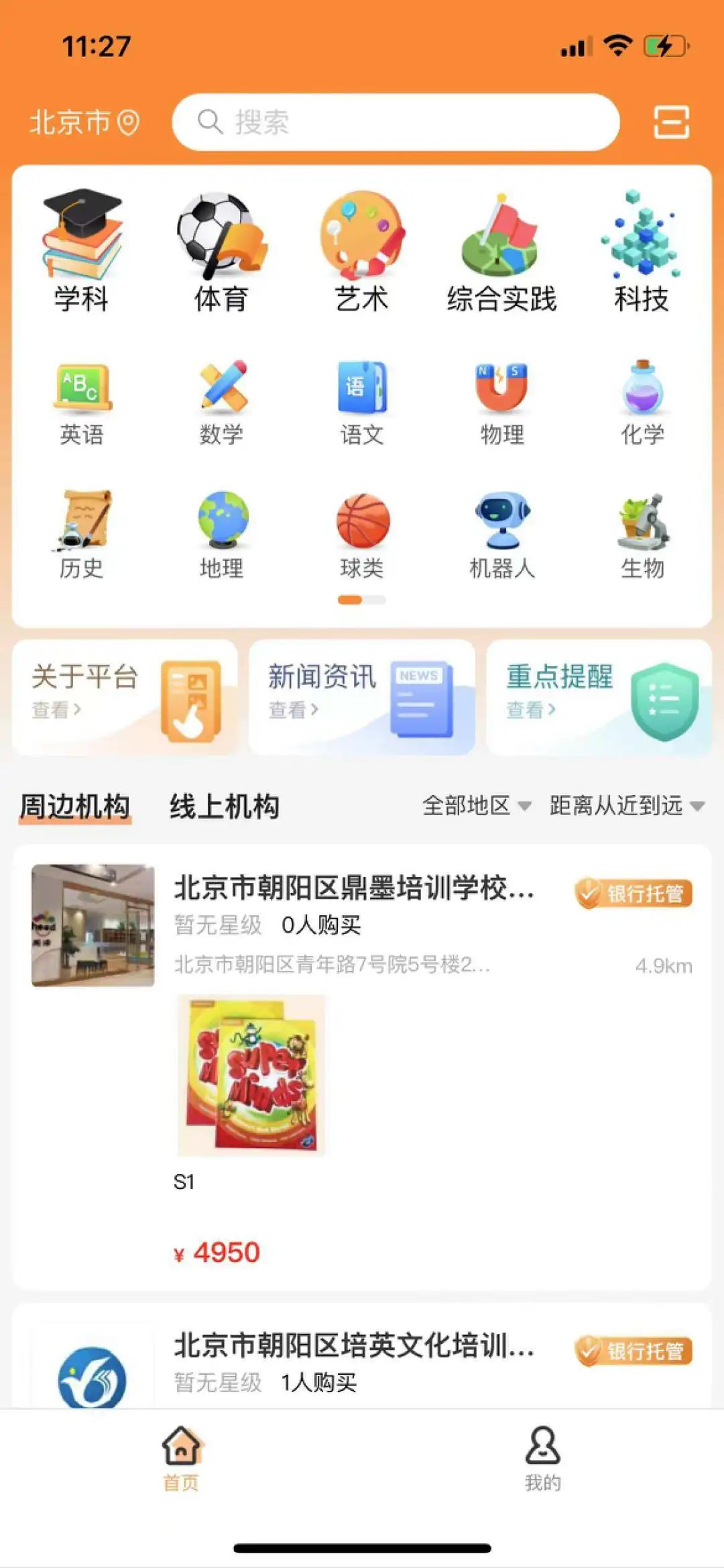 在“校外培訓家長端”App首頁,有學科、體育、藝術、綜合實踐、科技、英語、數(shù)學、語文、物理、化學、歷史、地理等所有校外學科,集中了當?shù)氐木€下教育培訓機構。
