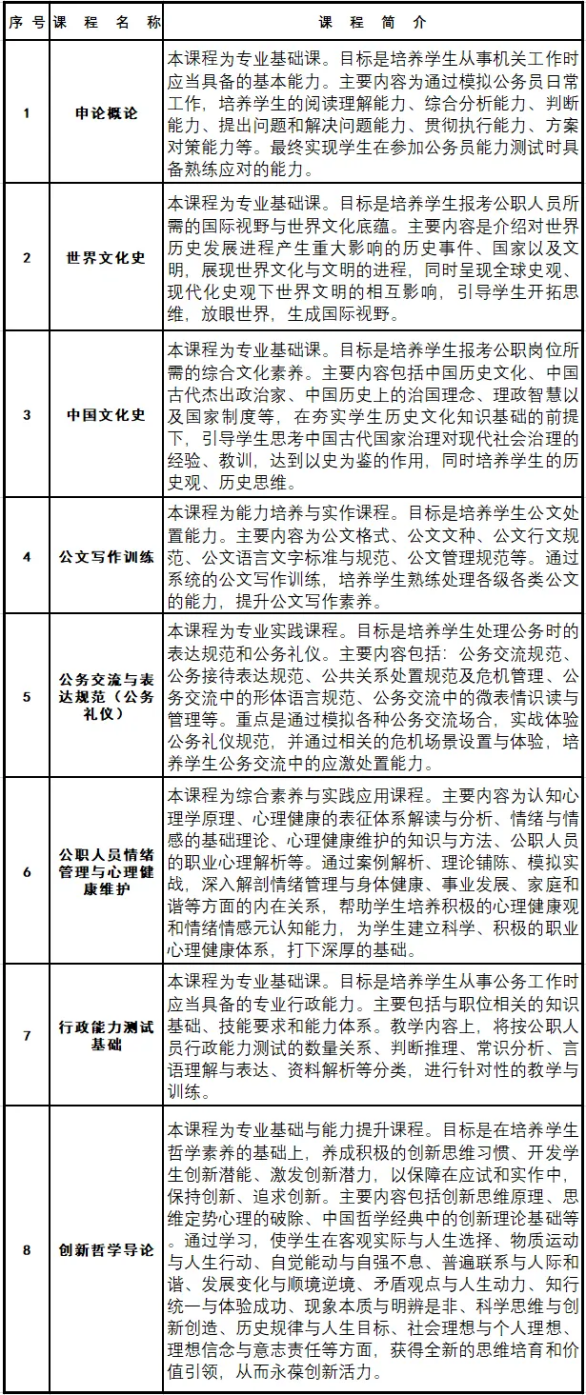 學(xué)制1年共兩學(xué)期。第一學(xué)期開展文化基礎(chǔ)課程教學(xué),包括申論概論、世界文化史、中國文化史、創(chuàng)新哲學(xué)導(dǎo)論等課程;第二學(xué)期開展素質(zhì)拓展與能力培養(yǎng)課程教學(xué),包括行政能力測試基礎(chǔ)、公文寫作、公務(wù)交流與表達(dá)規(guī)范(公務(wù)禮儀)、公職人員情緒管理與心理健康維護(hù)等課程。