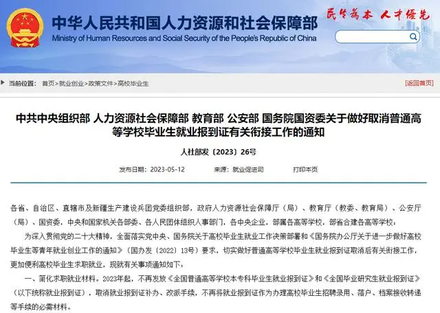 2023-05-13 09:47:19閱讀()人民政協(xié)網(wǎng)據(jù)人社部網(wǎng)站消息,日前中共中央組織部、人力資源社會(huì)保障部、教育部、公安部、國(guó)務(wù)院國(guó)資委發(fā)布《關(guān)于做好取消普通高等學(xué)校畢業(yè)生就業(yè)報(bào)到證有關(guān)銜接工作的通知》(以下簡(jiǎn)稱《通知》)?!锻ㄖ访鞔_,2023年起,不再發(fā)放《全國(guó)普通高等學(xué)校本專(zhuān)科畢業(yè)生就業(yè)報(bào)到證》和《全國(guó)畢業(yè)研究生就業(yè)報(bào)到證》(以下統(tǒng)稱“就業(yè)報(bào)到證”),取消就業(yè)報(bào)到證補(bǔ)辦、改派手續(xù),不再將就業(yè)報(bào)到證作為辦理高校畢業(yè)生招聘錄用、落戶、檔案接收轉(zhuǎn)遞等手續(xù)的必需材料。