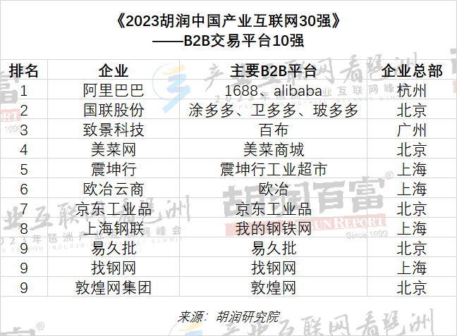 阿里巴巴、國(guó)聯(lián)股份、致景科技、美菜網(wǎng)、震坤行、歐冶云商、京東工業(yè)品、上海鋼聯(lián)、易久批、找鋼網(wǎng)、敦煌網(wǎng)集團(tuán)獲評(píng)“B2B交易平臺(tái)10強(qiáng)”。