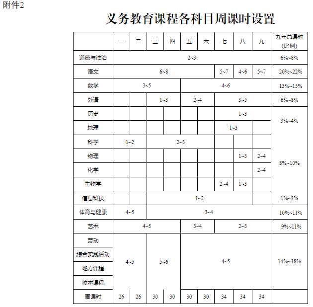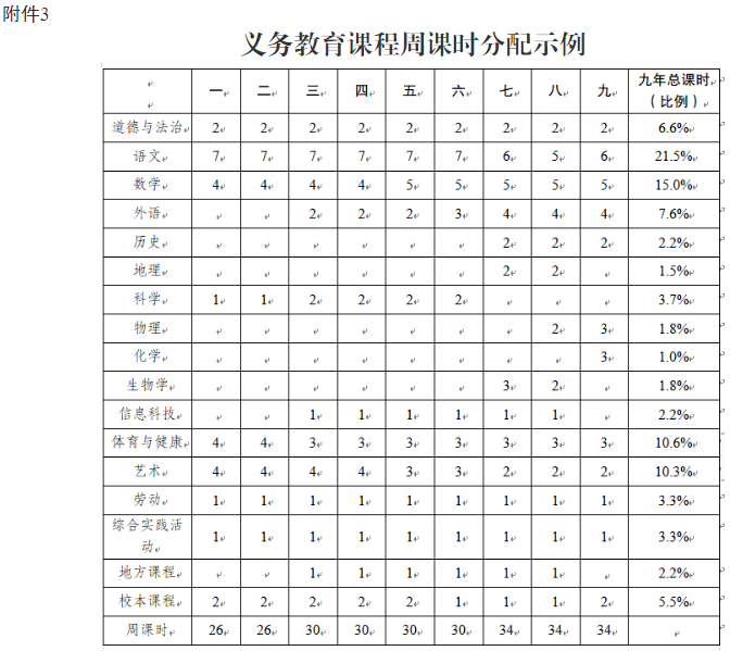 各級(jí)教育行政部門和義務(wù)教育學(xué)校應(yīng)嚴(yán)格落實(shí)國(guó)家課程方案要求,開(kāi)齊開(kāi)足國(guó)家課程,特別是信息科技、體育與健康、藝術(shù)、勞動(dòng)、綜合實(shí)踐活動(dòng)等課程,不隨意增減、占用課時(shí)。各科目安排及占九年總課時(shí)比例見(jiàn)附件1。勞動(dòng)、綜合實(shí)踐活動(dòng)課程自2022年秋季一至九年級(jí)開(kāi)始執(zhí)行,信息科技課程自2023年秋季三至八年級(jí)開(kāi)始執(zhí)行,其他學(xué)科自2024年秋季一年級(jí)、七年級(jí)開(kāi)始執(zhí)行,確保各科目在相應(yīng)年級(jí)的總課時(shí)數(shù)達(dá)到要求。課程比例設(shè)置和周課時(shí)分配示例見(jiàn)附件2、附件3。