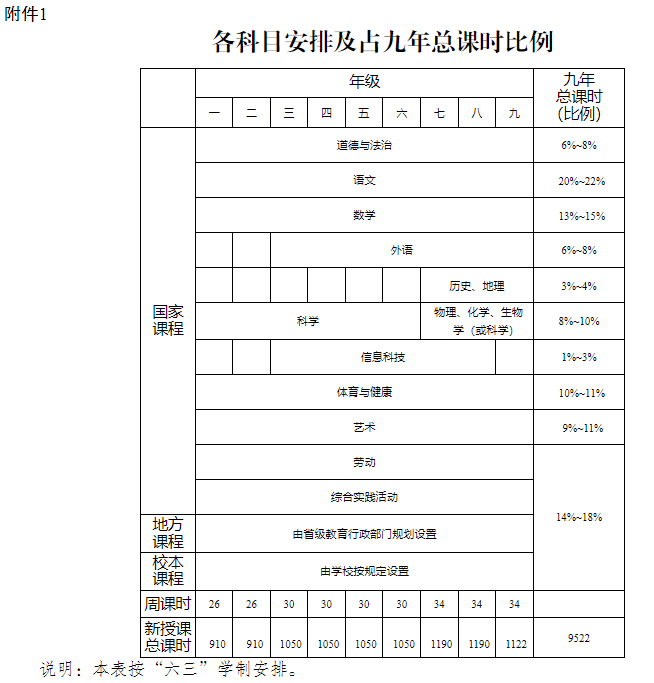 一至二年級(jí)每周26課時(shí),三至六年級(jí)每周30課時(shí),七至九年級(jí)每周34課時(shí),九年新授課總課時(shí)數(shù)為9522。小學(xué)每課時(shí)按40分鐘計(jì)算,初中每課時(shí)按45分鐘計(jì)算。