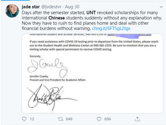 該網(wǎng)貼還控訴說(shuō),北得克薩斯州大學(xué)的這一突如其來(lái)的決定,會(huì)給受影響的中國(guó)公派學(xué)生和學(xué)者帶來(lái)了大量不便,迫使他們一邊為了回國(guó)要拼命找地方做新冠肺炎的檢測(cè),一邊還得面對(duì)因疫情沖擊而價(jià)格暴漲且數(shù)量極為有限的機(jī)票困境。