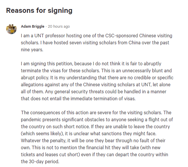 其中,一名直接參與了該校中國(guó)公派學(xué)生學(xué)者項(xiàng)目的教授,就在上述求助帖中留言,表示學(xué)校對(duì)這些中國(guó)留學(xué)生和學(xué)者的做法“是不公平的”,而且也是“毫無(wú)必要”的,因?yàn)樗麤]聽說(shuō)過北得克薩斯州大學(xué)的任何中國(guó)公派留學(xué)生和學(xué)者中,有人遭到任何具體的指控。所以他無(wú)法理解為何學(xué)校要一下子就把所有中國(guó)公派留學(xué)生和學(xué)者全都趕走。