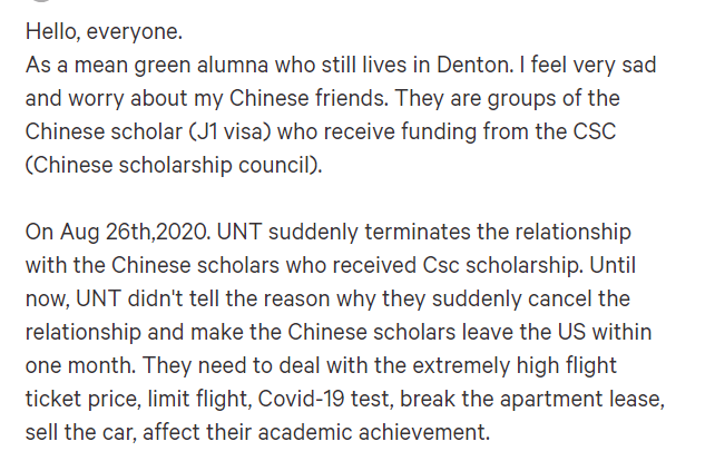 在美國(guó)請(qǐng)?jiān)割愋畔⒕W(wǎng)站“Change.org”上,一則為北得克薩斯州大學(xué)的中國(guó)留學(xué)生求助的網(wǎng)貼就表示,該校是在8月26日當(dāng)天突然宣布中止受中國(guó)國(guó)家留學(xué)基金委員會(huì)資助的訪問學(xué)生和學(xué)者的學(xué)習(xí)資格的,并要求這些持有J-1類簽證的中國(guó)公派留學(xué)生和學(xué)者在1個(gè)月內(nèi)離境。可該校至今也沒有透露這么做的原因是什么。