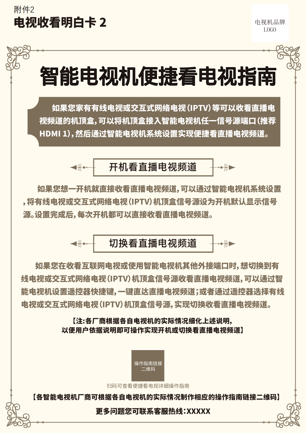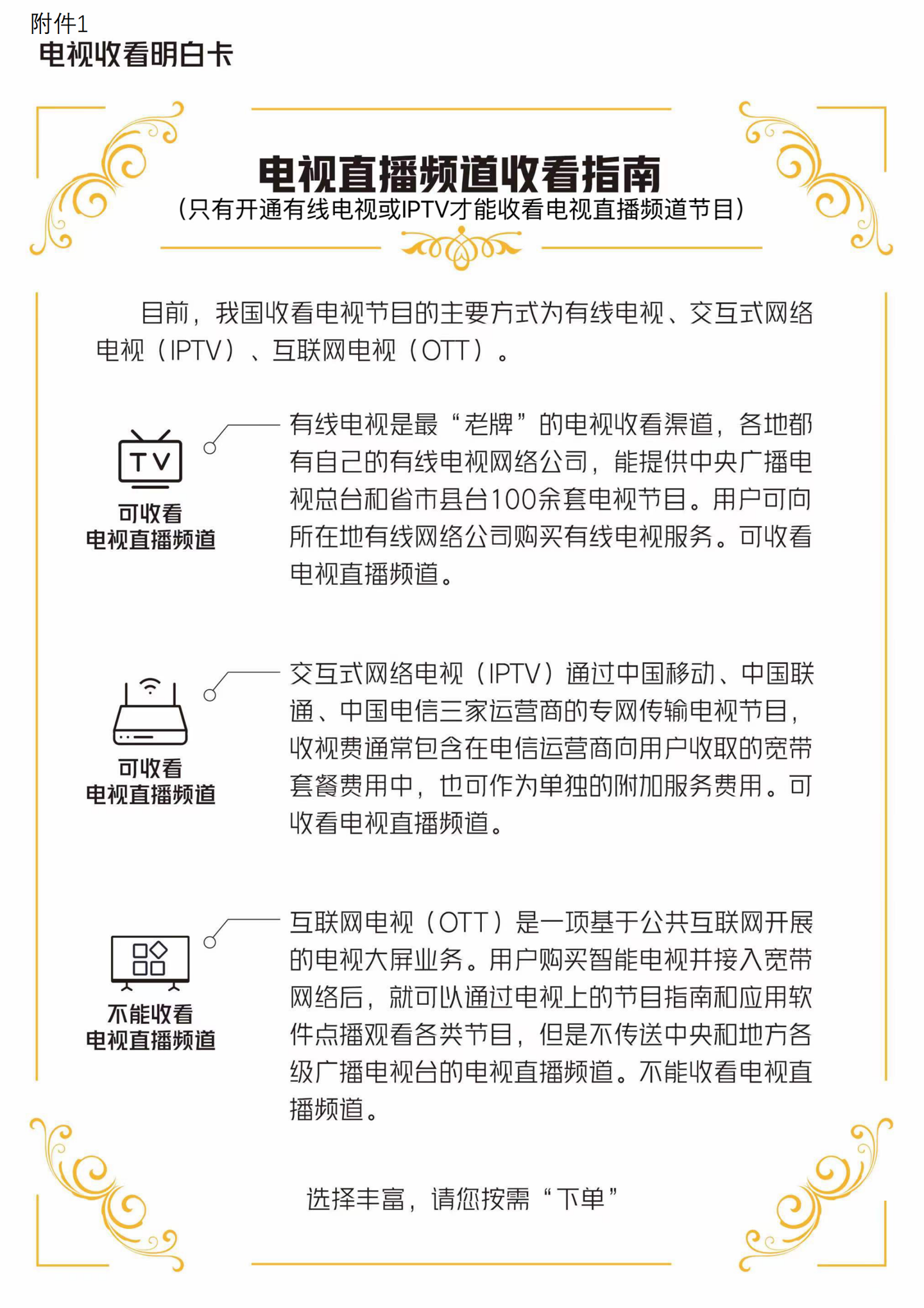 自2023年11月起,各電視機(jī)生產(chǎn)廠商要將制作完成的《電視收看“明白卡”》裝入電視機(jī)包裝箱內(nèi)的說明材料中,同時(shí)在電商銷售頁面、線下實(shí)體銷售和廠商入戶安裝電視機(jī)過程中,將“明白卡”內(nèi)容向用戶明確展示,并告知用戶只有開通有線電視或IPTV方可收看電視直播頻道節(jié)目。