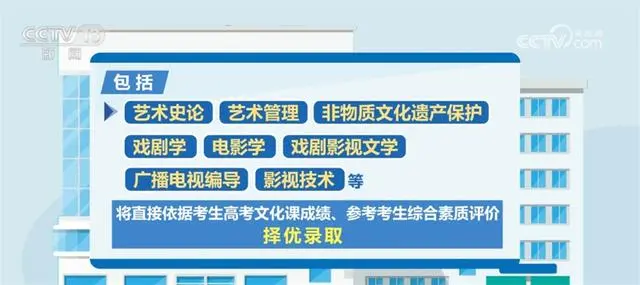 據(jù)了解,藝術類專業(yè)依據(jù)考生高考文化成績、專業(yè)考試成績,參考綜合素質評價進行招生錄取。此次藝考改革一個重要的變化是,部分藝術類專業(yè)不再組織專業(yè)考試,包括藝術史論、藝術管理、非物質文化遺產(chǎn)保護、戲劇學、電影學、戲劇影視文學、廣播電視編導、影視技術等,將直接依據(jù)考生高考文化課成績、參考考生綜合素質評價,擇優(yōu)錄取。