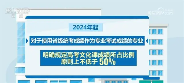 此外,2024年起,對于使用省級統(tǒng)考成績作為專業(yè)考試成績的專業(yè),明確規(guī)定高考文化課成績所占比例原則上不低于50%。同時,鼓勵??几咝=Y合專業(yè)培養(yǎng)要求,進一步提高考生高考文化課成績錄取要求。
