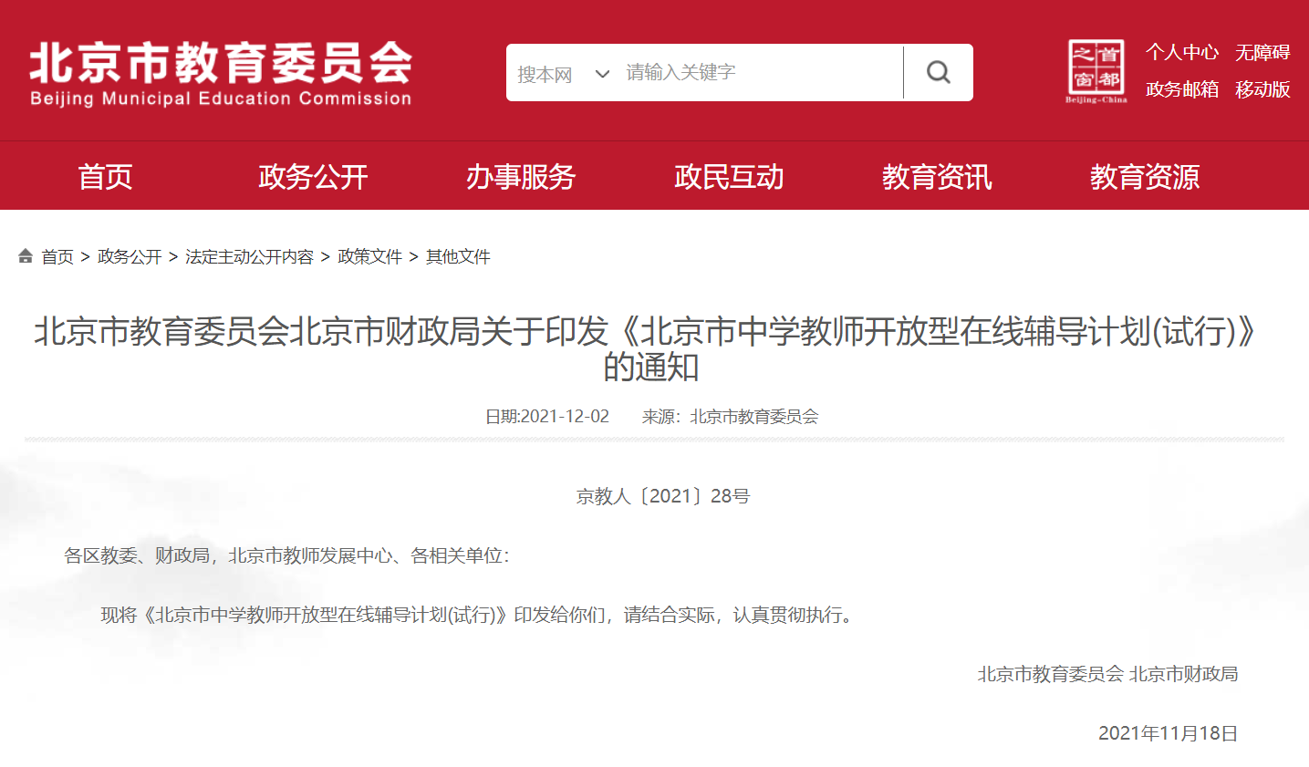 12月3日消息,北京市教育委員會12月2日公布北京市教育委員會、北京市財政局關(guān)于印發(fā)《北京市中學(xué)教師開放型在線輔導(dǎo)計劃(試行)》(下稱《計 ...