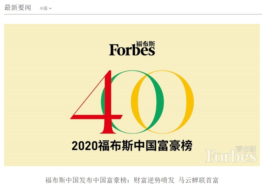 福布斯發(fā)布中國富豪榜:馬云連續(xù)三年蟬聯(lián)中國首富