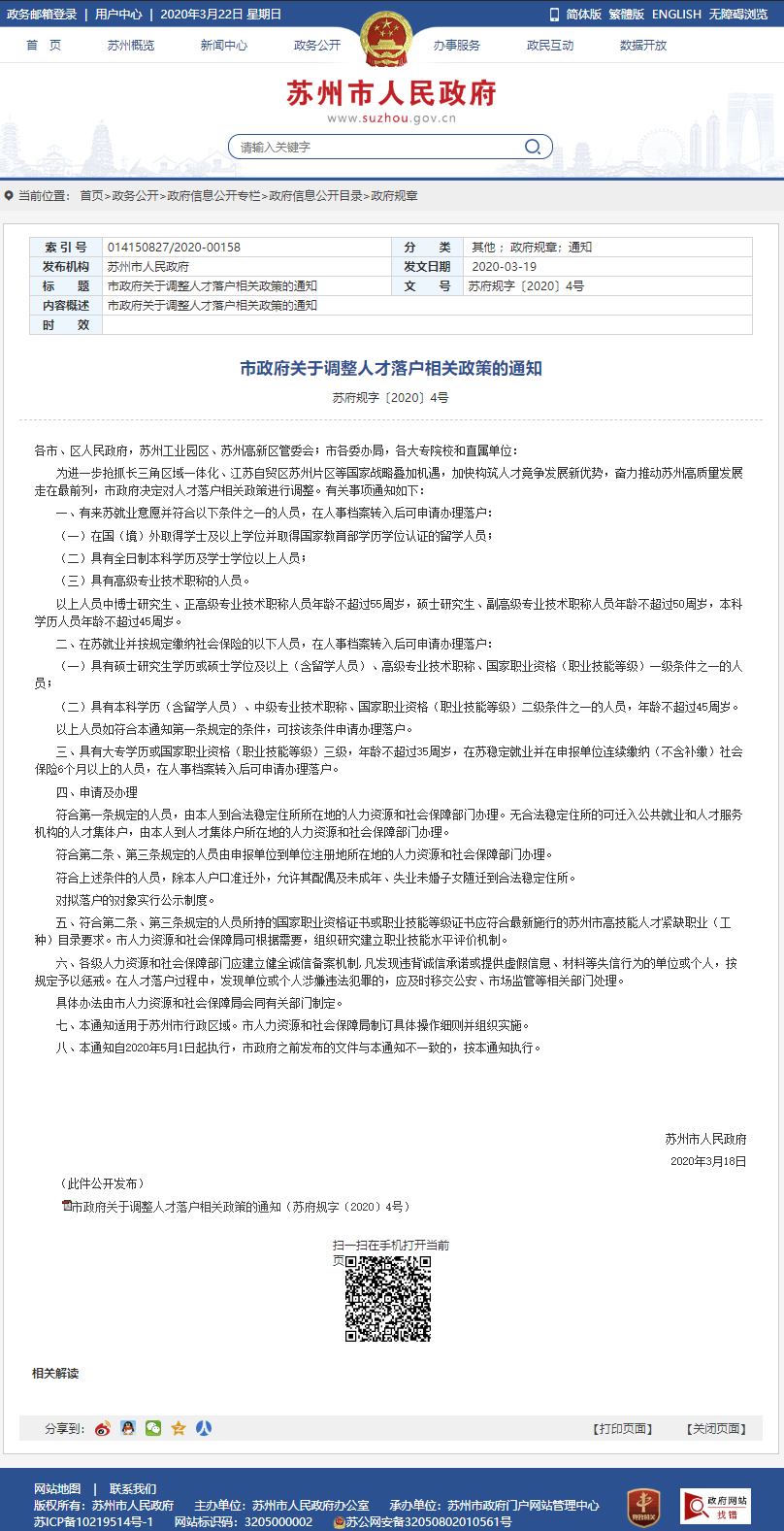 據(jù)江蘇省蘇州市政府官網(wǎng),20日,蘇州市政府發(fā)布關(guān)于調(diào)整人才落戶相關(guān)政策的通知,包括具有全日制本科學(xué)歷及學(xué)士學(xué)位以上人員即可申請落戶等 ...