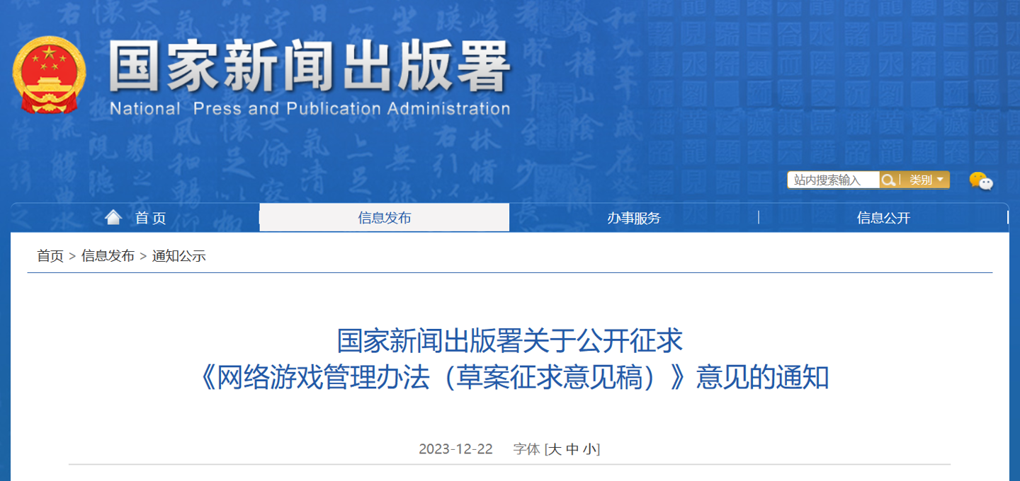 12月22日消息,國(guó)家新聞出版署今日發(fā)布《網(wǎng)絡(luò)游戲管理辦法(草案征求意見(jiàn)稿)》,現(xiàn)向社會(huì)公開征求意見(jiàn)。文件中提到,網(wǎng)絡(luò)游戲不得設(shè)置每日 ...