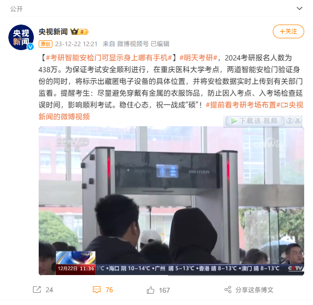 明天(12月23日),2024年全國(guó)碩士研究生招生考試將正式開考。據(jù)央視新聞,今年多個(gè)省份在考研須知中明確表示,考生入場(chǎng)時(shí)將新增智能安全門檢 ...