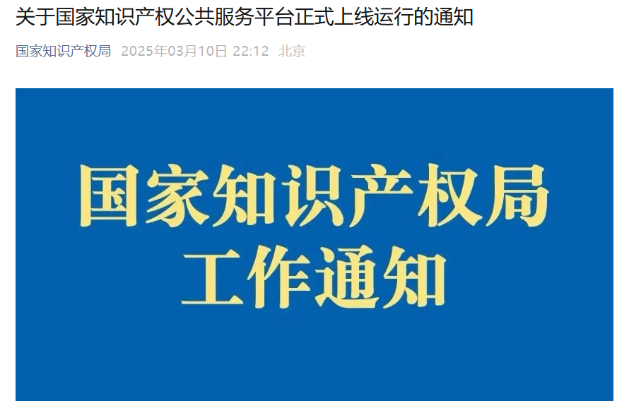 國(guó)家知識(shí)產(chǎn)權(quán)局發(fā)布《關(guān)于國(guó)家知識(shí)產(chǎn)權(quán)公共服務(wù)平臺(tái)正式上線運(yùn)行的通知》,平臺(tái)定于2025年3月10日正式上線。附通知內(nèi)容如下:各省、自治區(qū) ...