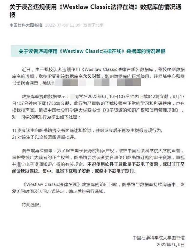 中國社會科學(xué)院大學(xué)圖書館近日發(fā)布通報稱,由于該校讀者違規(guī)使用《WestlawClassic法律在線》數(shù)據(jù)庫,該校接到數(shù)據(jù)庫商的通報,學(xué)校IP受到該 ...
