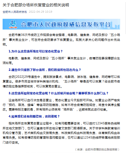 據(jù)合肥市人民政府發(fā)布微信號消息,合肥市第36次市疫防工作視頻會商會強調(diào),電影院、健身房、網(wǎng)吧及部分“五小場所”事關(guān)就業(yè)生計,可在符合 ...