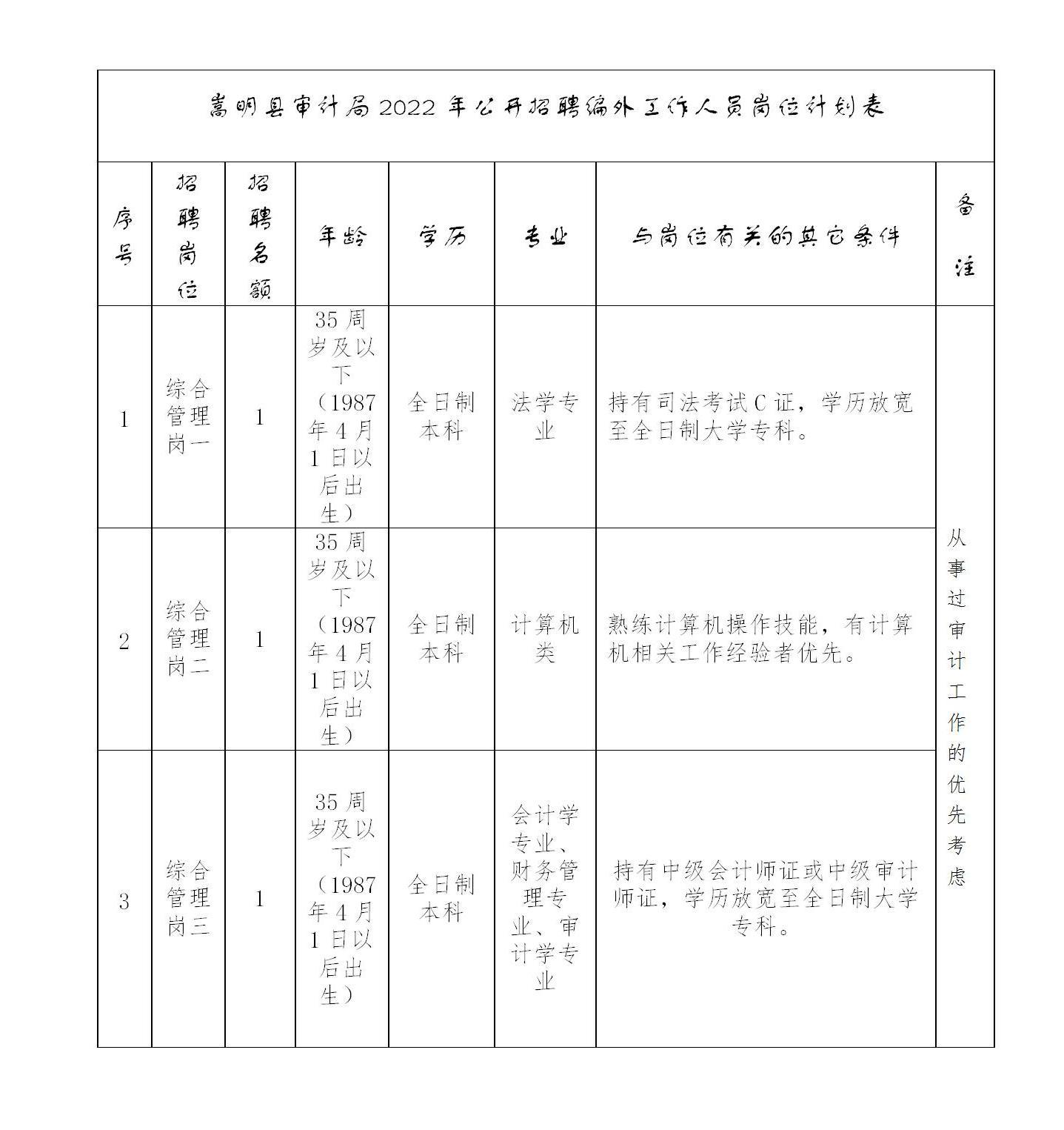 2022-04-07 00:04:34閱讀()昆明公共招聘網(wǎng)嵩明縣審計局為保障重點工作順利推進(jìn),滿足本單位相關(guān)崗位用人需要,現(xiàn)委托嵩明嘉益人力資源有限公司通過合規(guī)和高效的招聘程序,引進(jìn)具有專業(yè)知識技能及符合單位用人標(biāo)準(zhǔn)的優(yōu)秀人才,結(jié)合當(dāng)前工作實際,面向社會公開招聘編外工作人員。具體招聘事項如下: