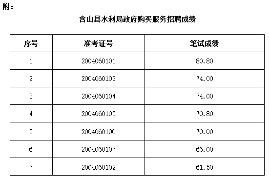 2020-04-11 11:59:31閱讀()含山縣人民政府按照《縣水利局公開招聘政府購買服務(wù)工作人員公告》,現(xiàn)將招聘成績進(jìn)行公示,公示期限3天,自2020年4月8日至2020年4月10日。
