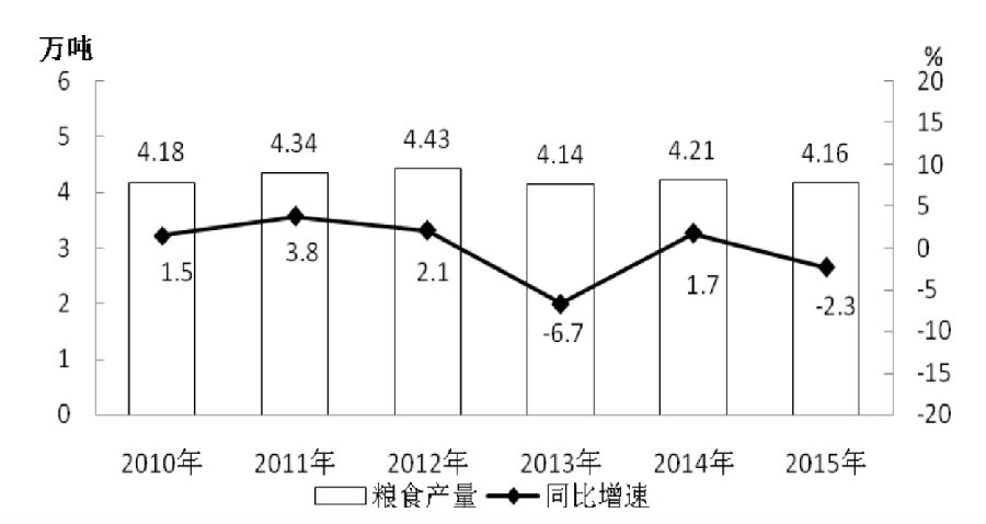例題:某市2015年全年糧食總產(chǎn)量4.16萬噸,同比下降2.3%;甘蔗產(chǎn)量0.57萬噸,下降23.6%;油料產(chǎn)量0.12萬噸,增長(zhǎng)32.4%;蔬菜產(chǎn)量15.79萬噸,下降3.4%;水果產(chǎn)量7.84萬噸,增長(zhǎng)7.4%。