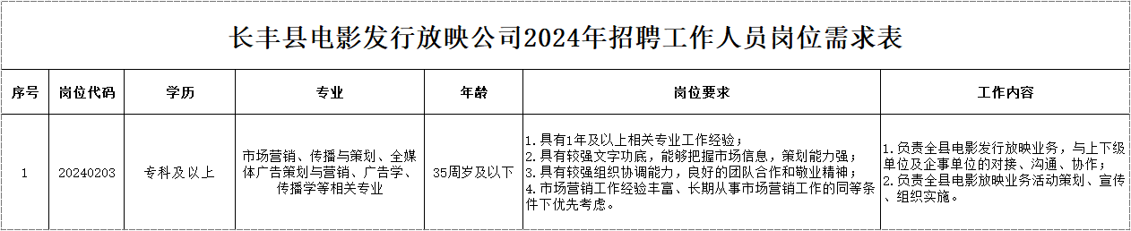 長豐縣電影發(fā)行放映公司2024年招聘工作人員補(bǔ)充公告