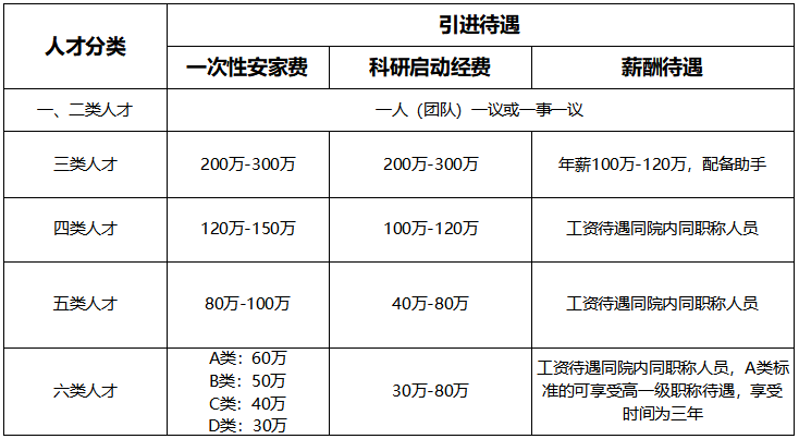 積極鼓勵引進人才團隊,實行“一事一策”,團隊成員按同層次人才上浮 10% 享受待遇;團隊科研啟動經(jīng)費300-600 萬元?;虬凑請F隊人才類型對應的科研啟動經(jīng)費累計計發(fā)。