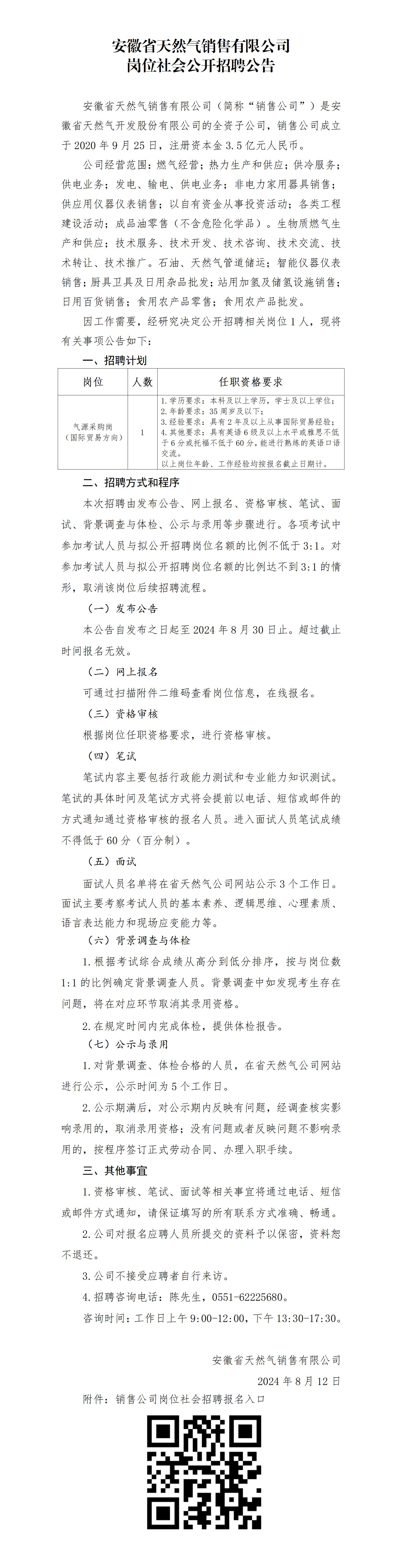 2024年安徽省天然氣銷售有限公司崗位社會(huì)公開招聘公告