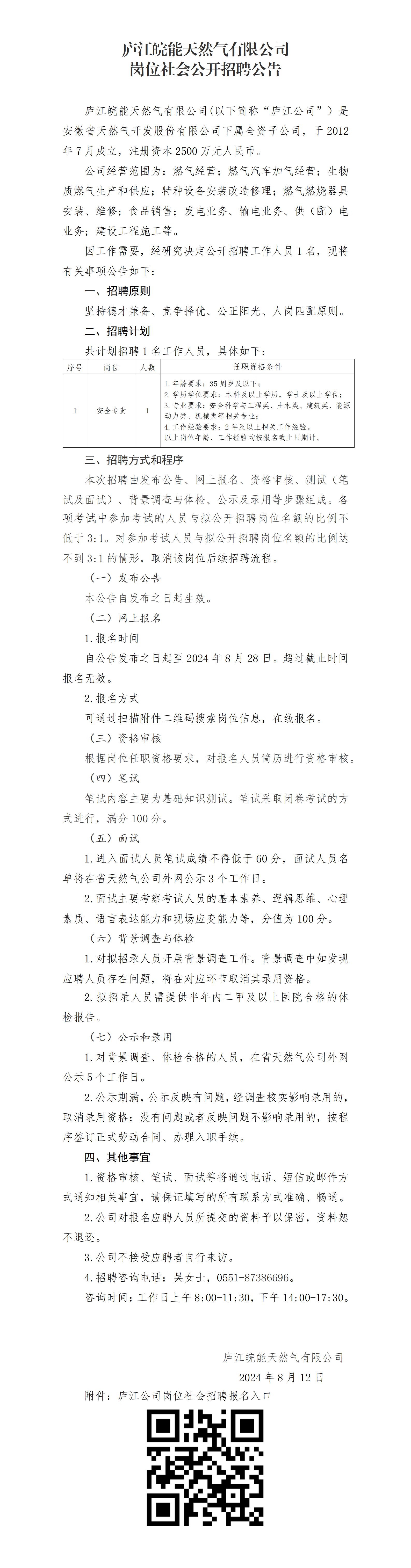 2024年合肥廬江皖能天然氣有限公司崗位社會公開招聘公告