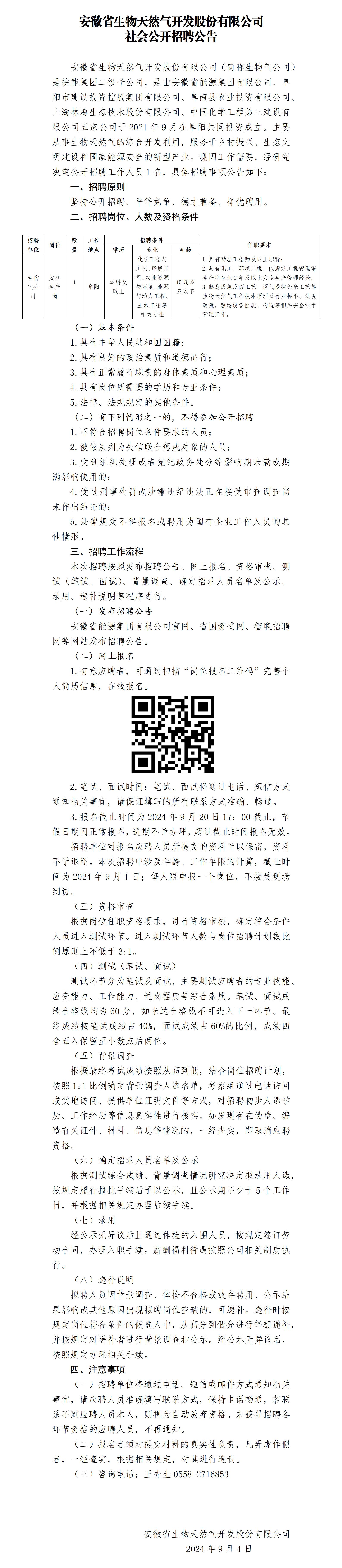 2024-09-11 15:14:57閱讀()安徽省能源集團(tuán)有限公司安徽省生物天然氣開(kāi)發(fā)股份有限公司(簡(jiǎn)稱(chēng)生物氣公司)是皖能集團(tuán)二級(jí)子公司,是由安徽省能源集團(tuán)有限公司、阜陽(yáng)市建設(shè)投資控股集團(tuán)有限公司、阜南縣農(nóng)業(yè)投資有限公司、上海林海生態(tài)技術(shù)股份有限公司、中國(guó)化學(xué)工程第三建設(shè)有限公司五家公司于2021年9月在阜陽(yáng)共同投資成立。主要從事生物天然氣的綜合開(kāi)發(fā)利用,服務(wù)于鄉(xiāng)村振興、生態(tài)文明建設(shè)和國(guó)家能源安全的新型產(chǎn)業(yè)。現(xiàn)因工作需要,經(jīng)研究決定公開(kāi)招聘工作人員1名,具體招聘事項(xiàng)公告如下: