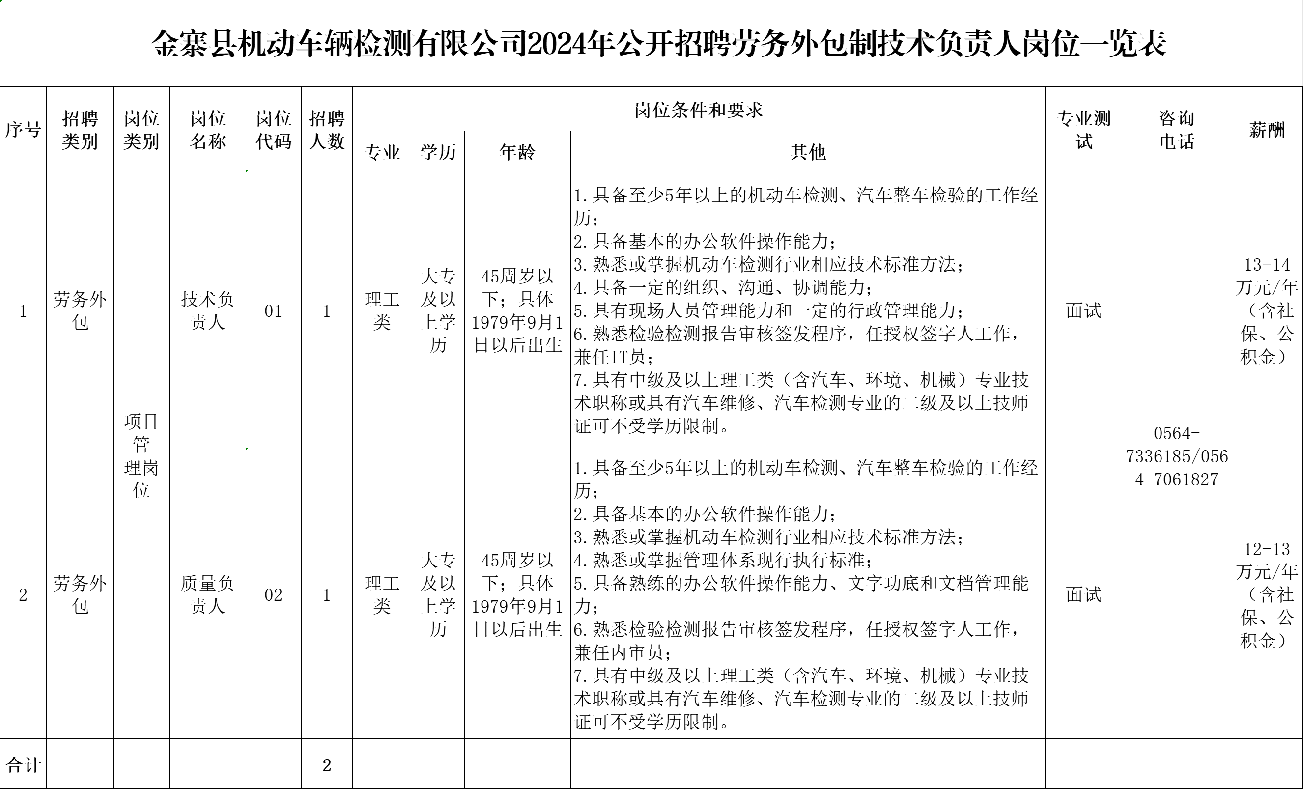 2024年六安金寨縣機(jī)動(dòng)車(chē)輛檢測(cè)有限公司公開(kāi)招聘勞務(wù)外包制技術(shù)負(fù)責(zé)人公告