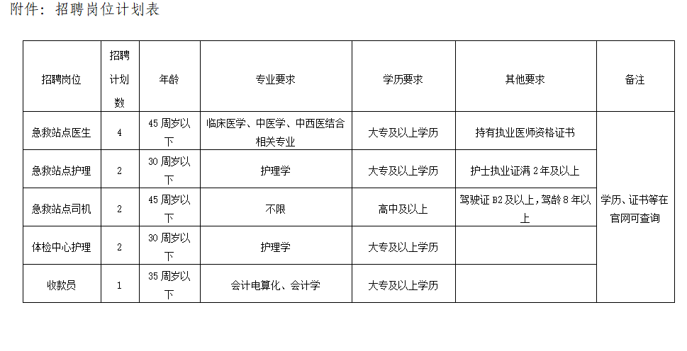 招聘急救站點(diǎn)醫(yī)生4人,急救站點(diǎn)護(hù)理2人,急救站點(diǎn)司機(jī)2人,體檢中心護(hù)理2人,收款員1人,合計(jì)11人,具體招聘崗位要求詳見附件。