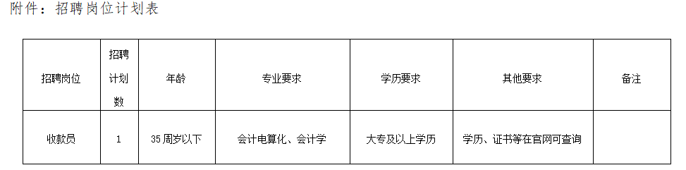 招聘收款員1人,合計(jì)1人,具體招聘崗位要求詳見附件。